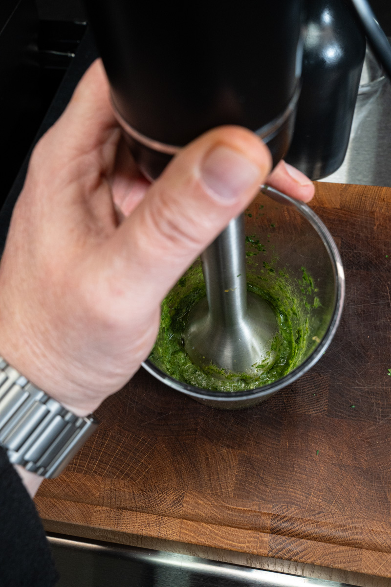 Die Blätter von Petersilie und Koriander abzupfen. Die Knoblauchzehen schälen und grob zerkleinern. Anschließend alle Zutaten in ein hohes Gefäß geben und mit dem Stabmixer fein pürieren.