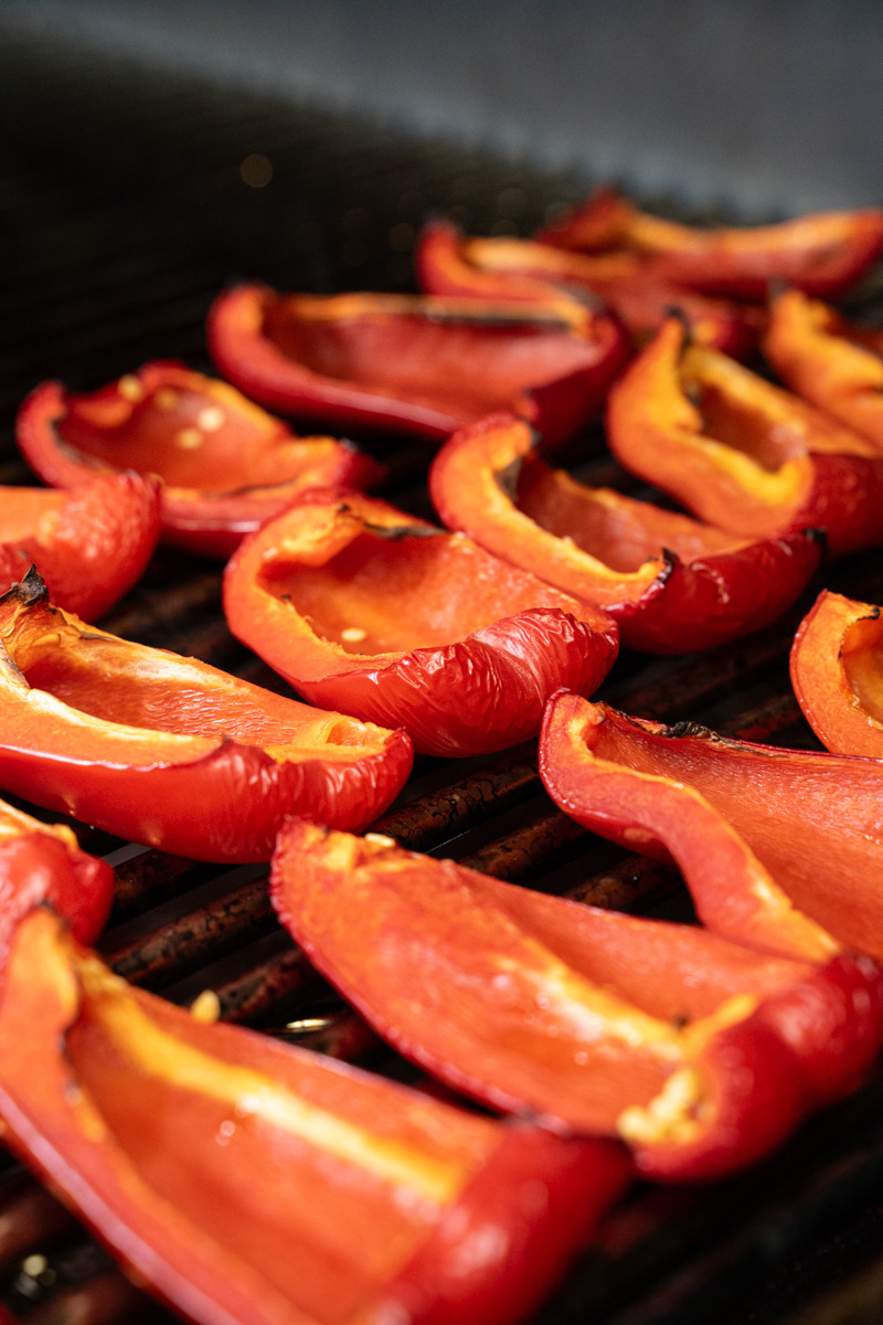 Die Paprikaschoten und die Chili in den indirekten Bereich des Grills legen, den Deckel schließen und weich garen. Die Haut darf dabei ruhig dunkel bis schwarz werden, da sie sich später leicht abziehen lässt und zusätzlich Röstaromen liefert.