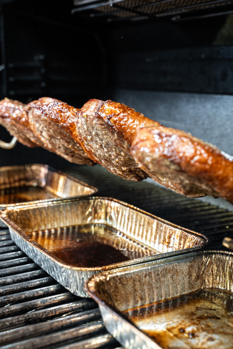 Sobald der Grill auf maximale Temperatur vorgeheizt ist, wird der Drehspieß eingesetzt und das Fleisch kann bei hoher Hitze seine volle Aromatik entfalten.