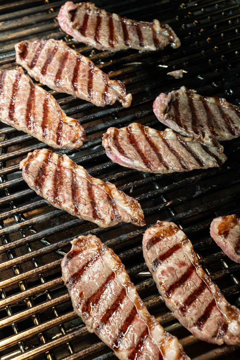 Die dünnen Scheiben werden dabei nur kurz gegrillt und entwickeln schnell die ersten Röstaromen, während sie innen saftig bleiben.