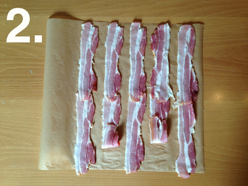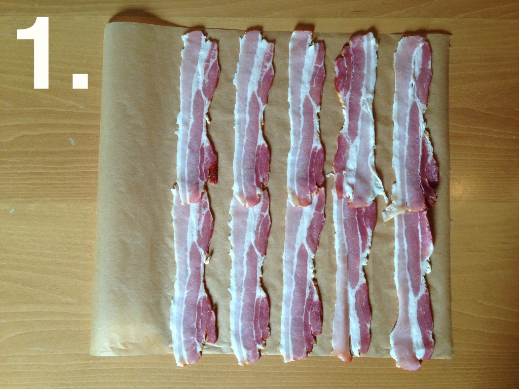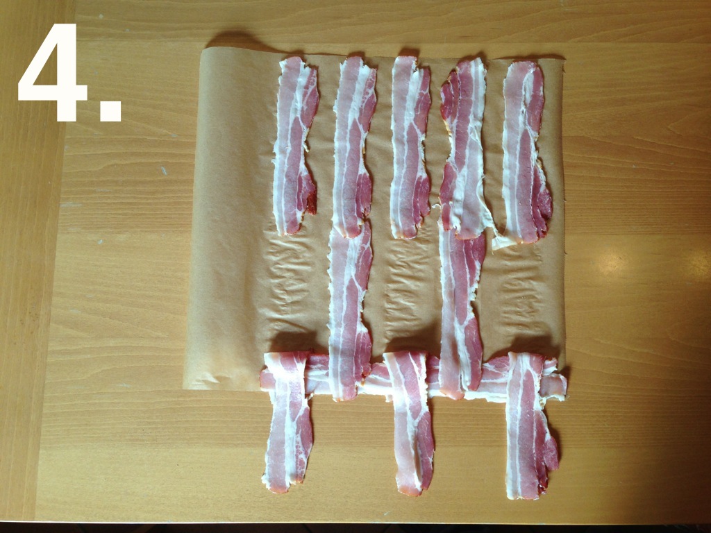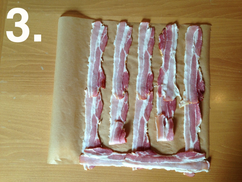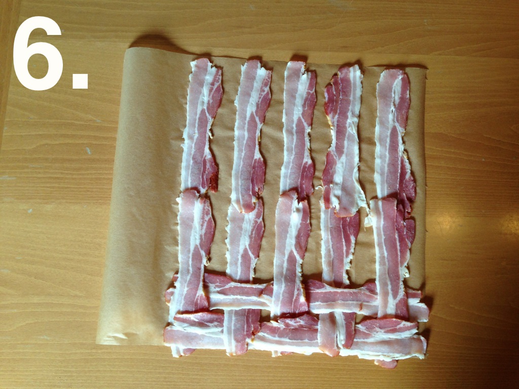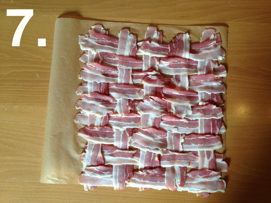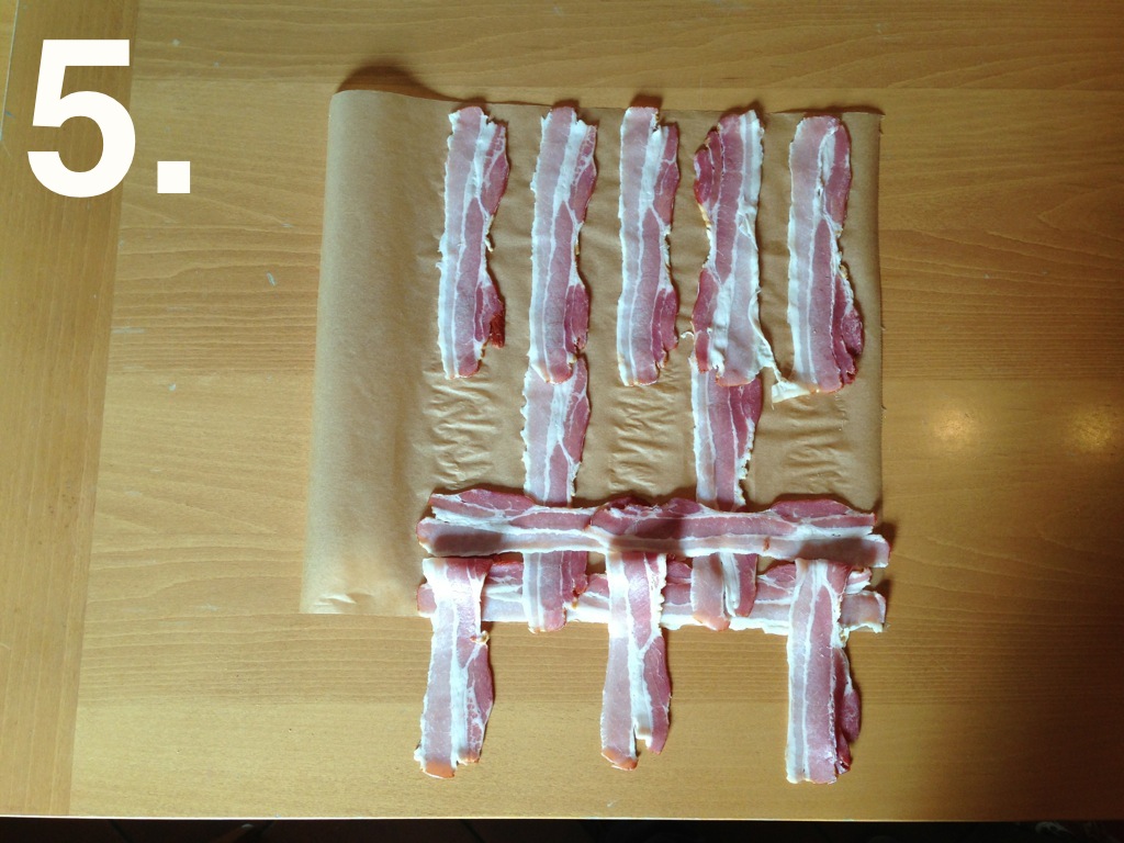 Die Bacon-Scheiben auf Backpapier zu einem Netz auslegen. Am Besten macht ihr das nach meiner altbekannten Anleitung am Beispiel von 28 Bacon-Streifen. Schaut einmal…