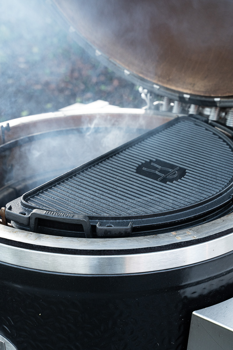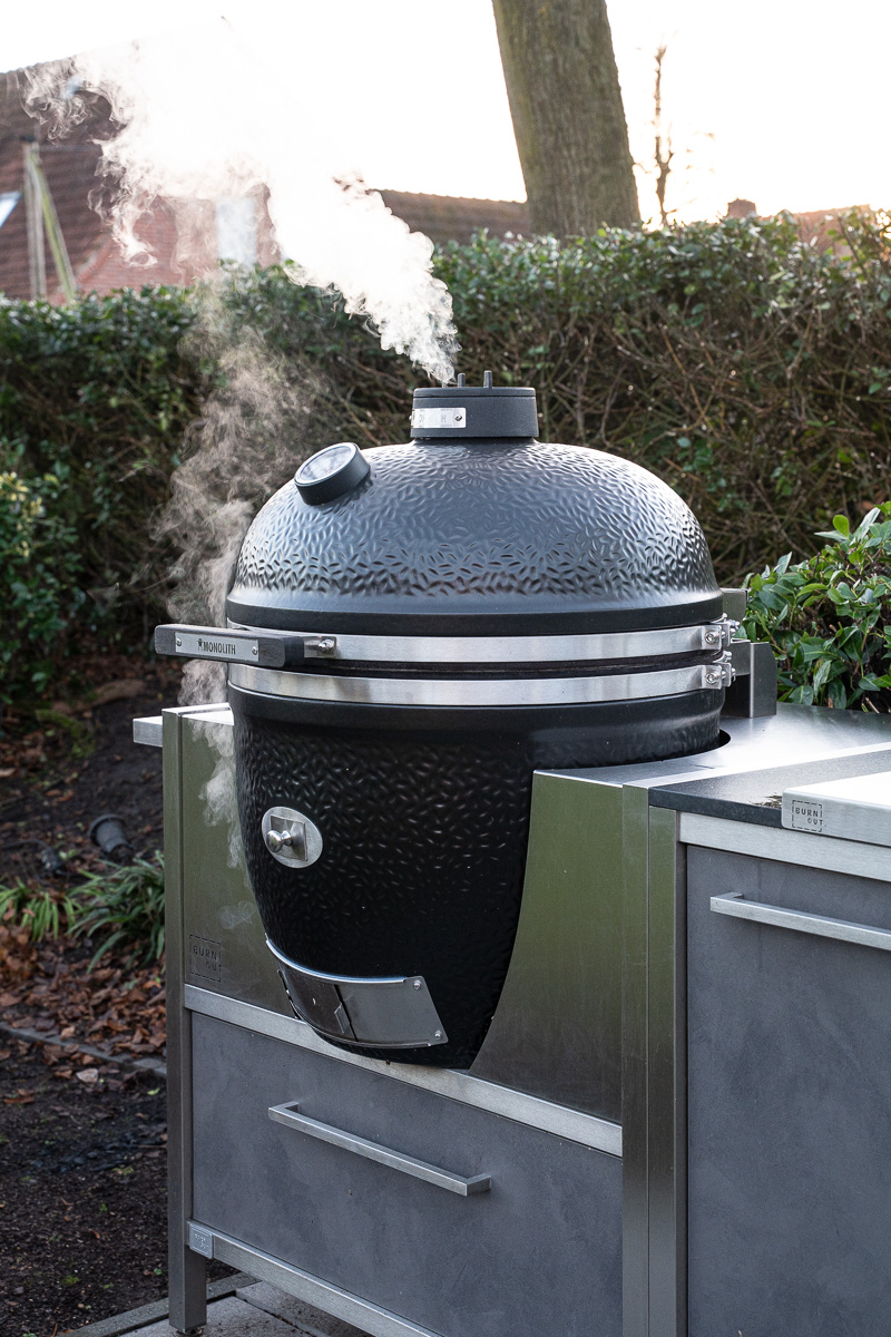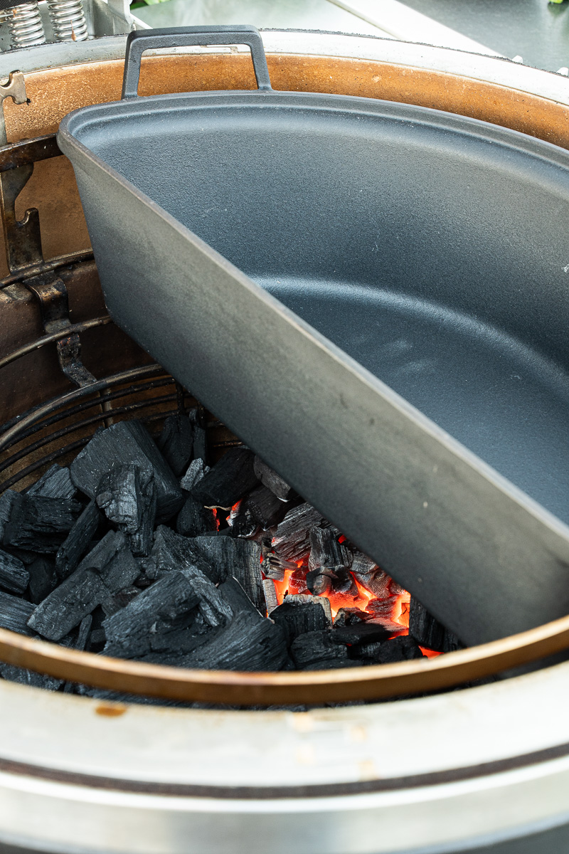 Eine Deflektorsteinhälfte unter dem SGS Feuertopf sorgt für indirekte Hitze. Der Topf wird geschlossen, ebenso der Grilldeckel.