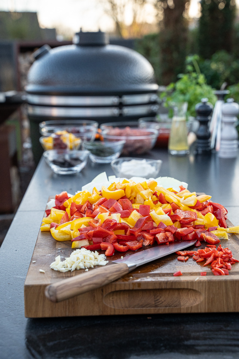 Paprika, Zwiebeln, Chilis und Knoblauch werden zunächst mit einem scharfen Messer fein gewürfelt. Diese Vorbereitung zahlt sich später in einer gleichmäßigen Textur aus.