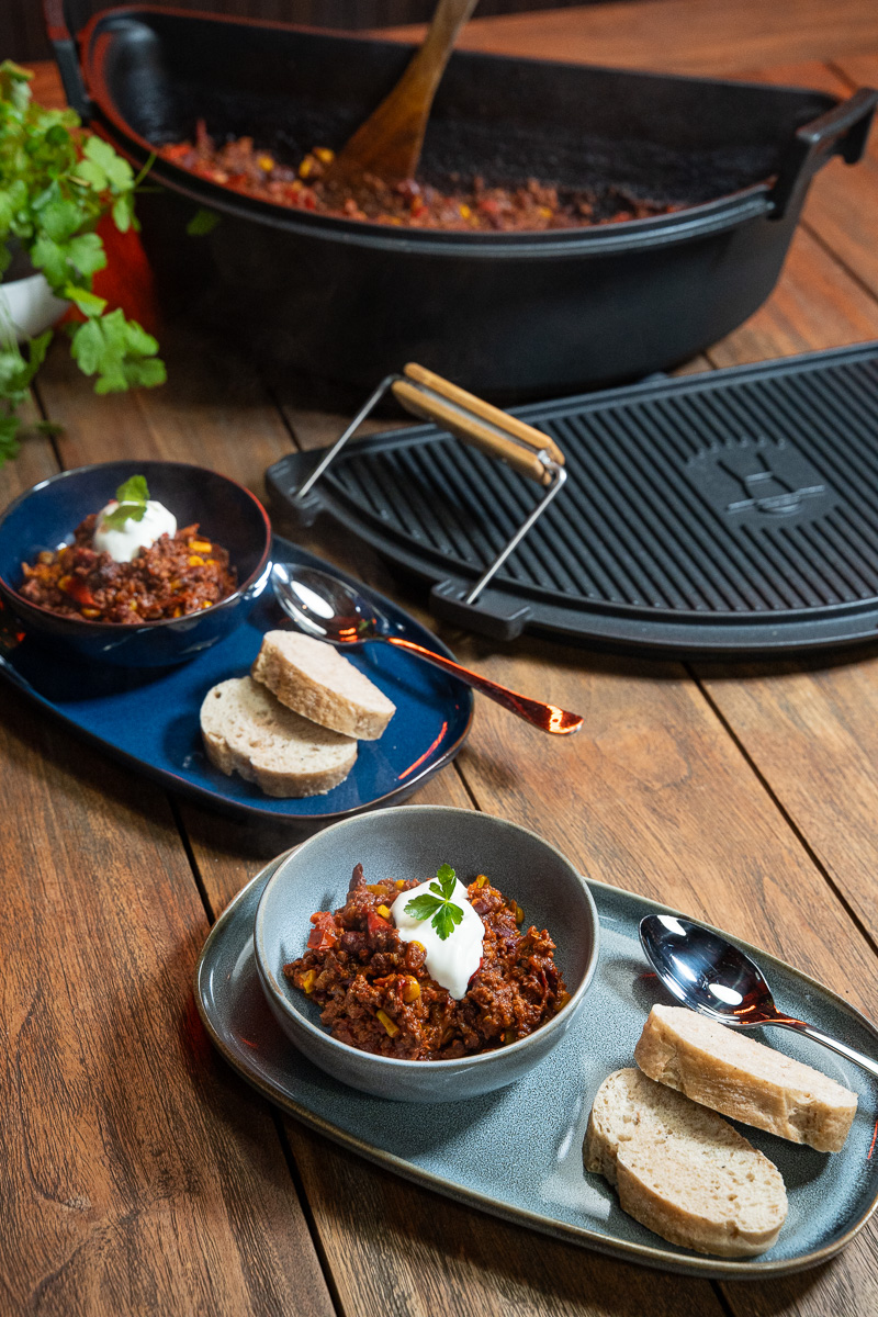 Zubereitet wird dieses herzhafte Gericht im Monolith SGS Feuertopf auf dem Monolith LeChef Avantgarde. Der massive Topf speichert Hitze gleichmäßig und macht das Chili besonders rund und vollmundig.
