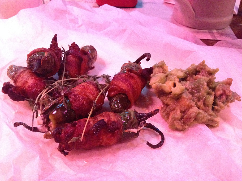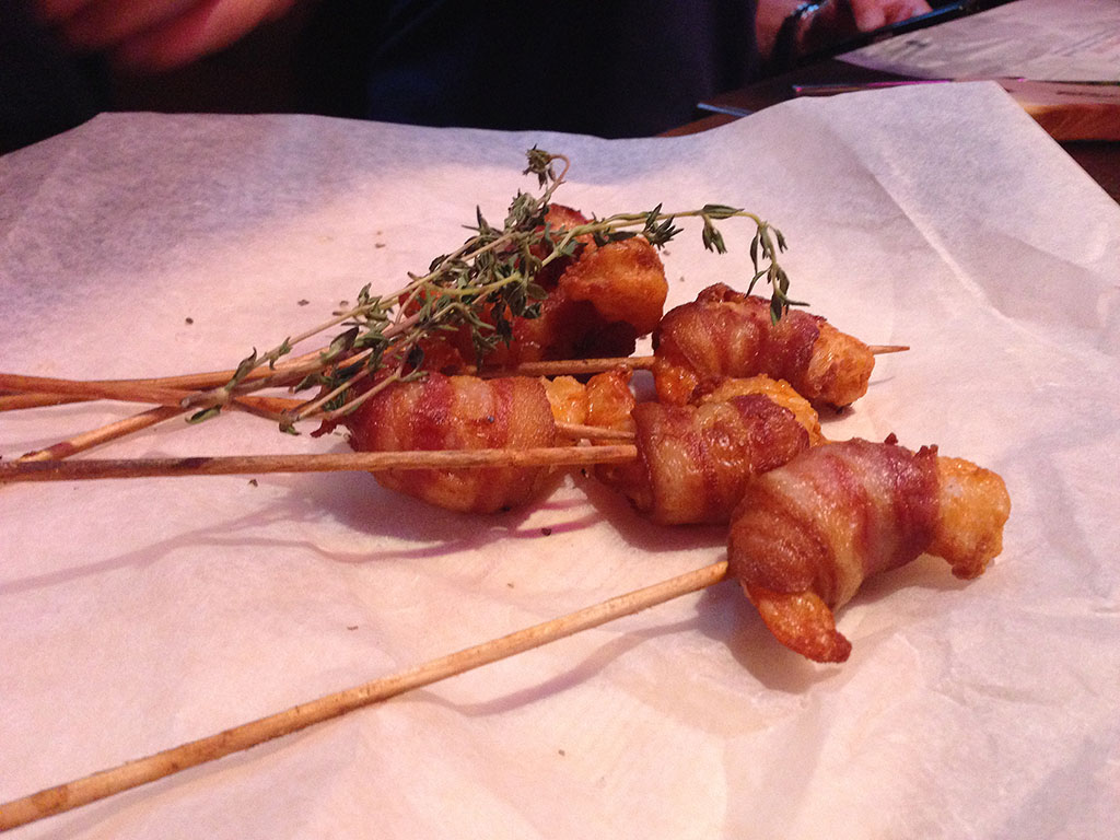 Zu unserer Freude gab es folgende Vorspeisen. Ihr seht – Bacon, Bacon, Bacon und – klar, Bacon – immer wieder Bacon!