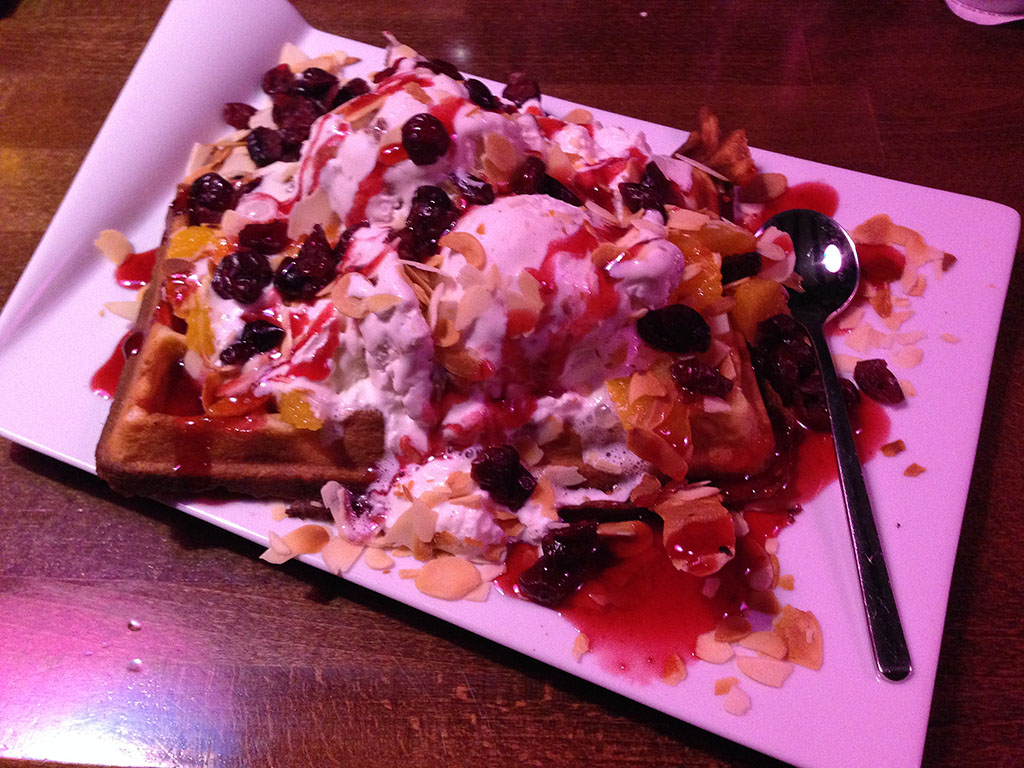 Mein absolutes Highlight waren die Belgischen Waffeln mit Vanilleeis, karamellisierten Erdnüssen, Cranberries, Honig, Ahornsirup und – was fehlt da noch? – klar, Bacon! :-)