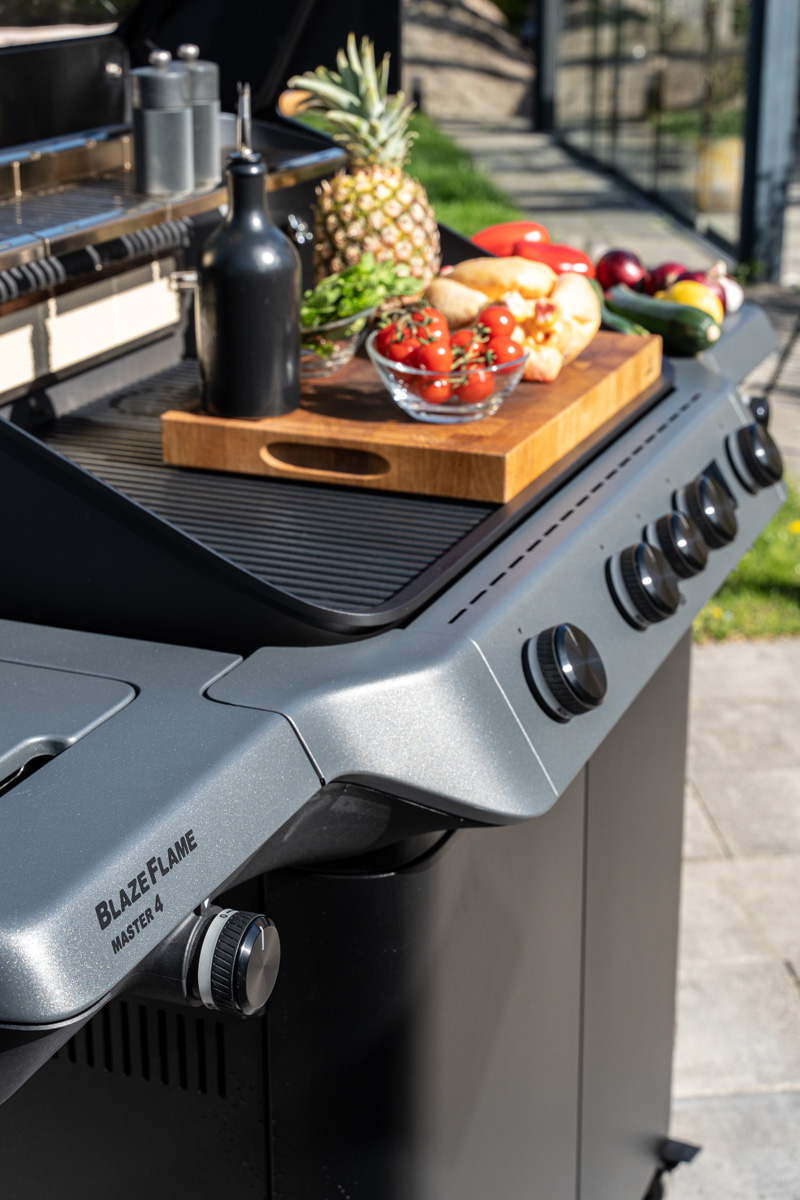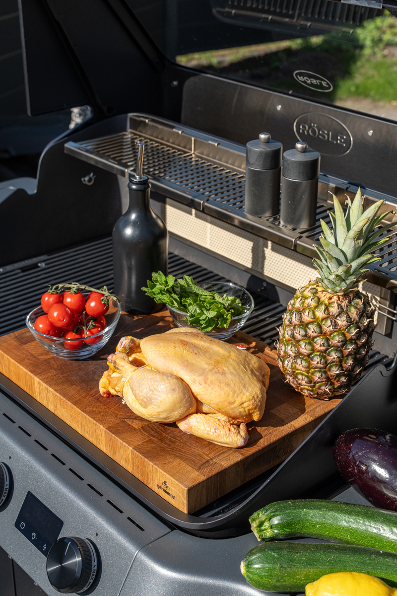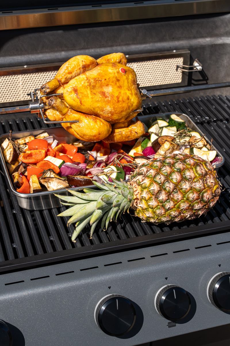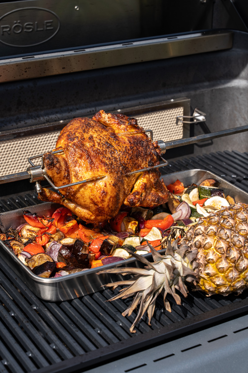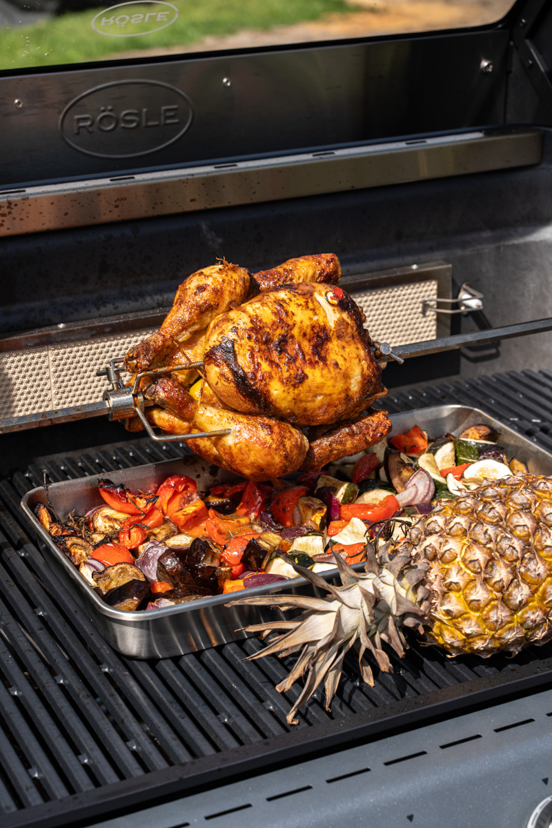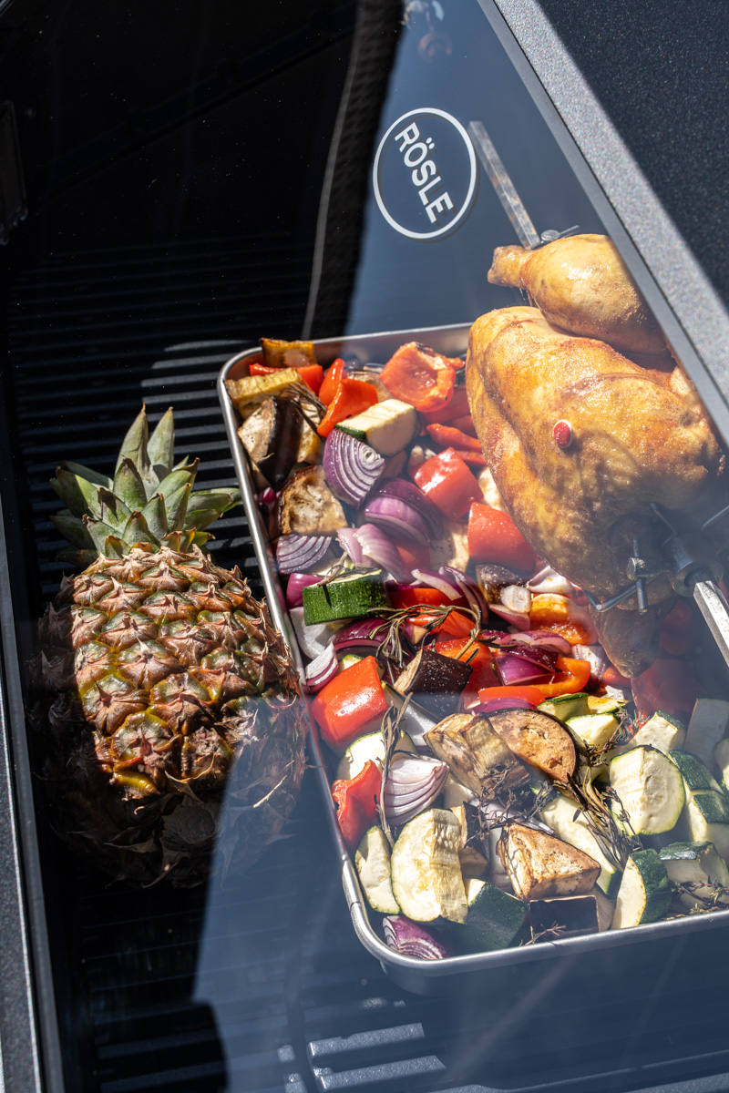 Ein weiterer Vorteil zeigt sich hier beim Rösle BLAZEFLAME Master 4: Der großzügige Garraum (Hauptgrillfläche: 80 x 47,5 cm) bietet ausreichend Platz im indirekten Bereich, sodass neben dem Drehspieß-Hähnchen problemlos auch Beilagen wie Gemüse und sogar eine ganze Ananas gleichzeitig zubereitet werden können.