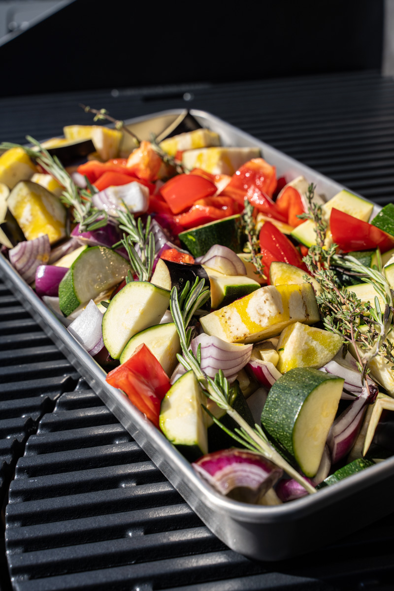 Zusätzlich kam bei unserer Rezeptumsetzung ein weiteres optionales Zubehör zum Einsatz: die Universalschale Edelstahl Pro. Sie eignet sich hervorragend zum Marinieren, Servieren oder als Tropfschale im Grill. In unserem Fall diente sie als Garform für das Gemüse und gleichzeitig als Auffangschale für den aromatischen Fleischsaft des Hähnchens.