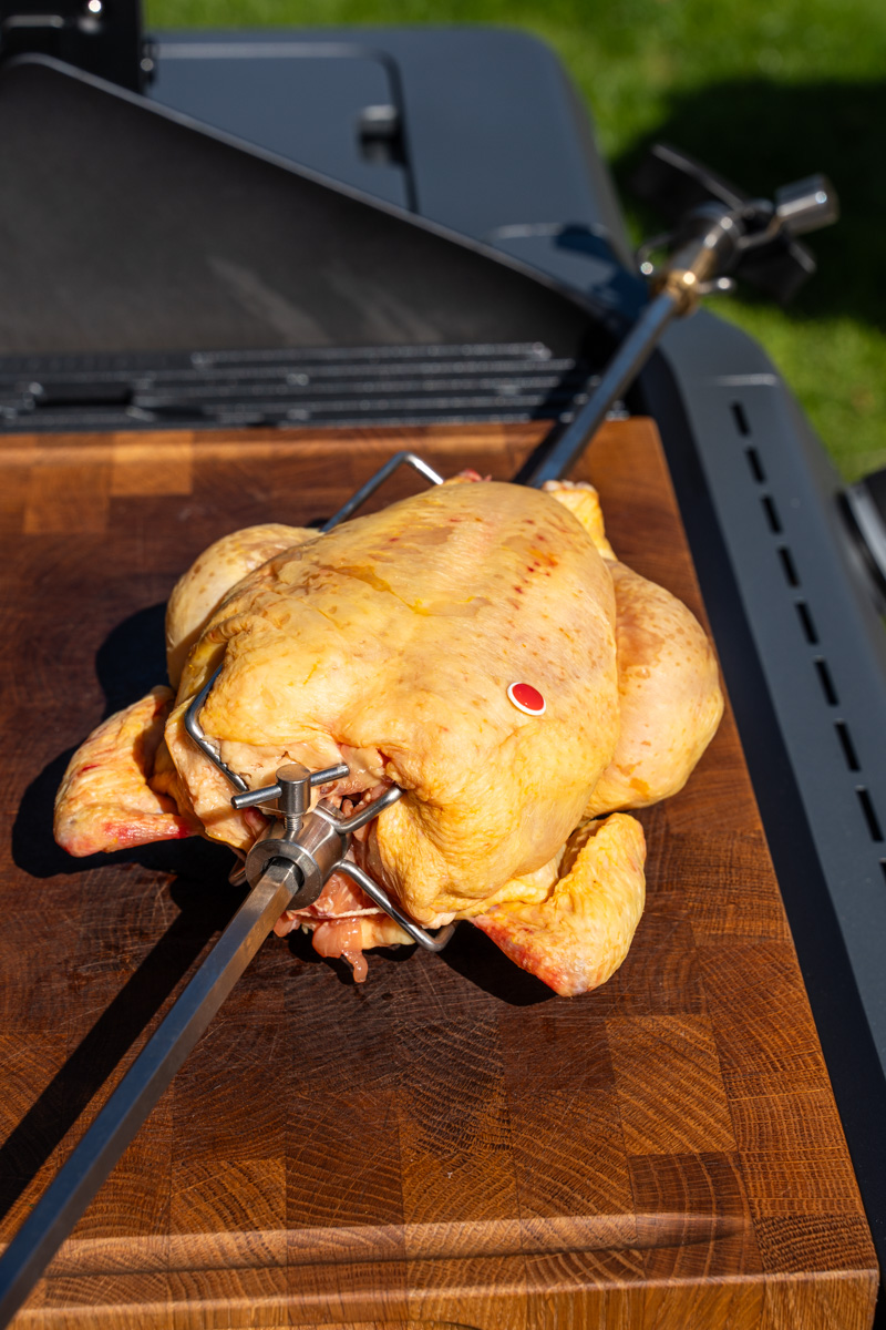 Neben dem Rösle BLAZEFLAME Master 4 ist dieses Kikok-Hähnchen unser zweiter Hauptdarsteller. Kikok-Hähnchen stehen für besonders hohe Fleischqualität: Die Tiere wachsen langsamer, haben mehr Bewegungsfreiheit und werden mit einem speziellen, überwiegend pflanzlichen Futterkonzept aufgezogen. Das Ergebnis ist ein deutlich aromatischerer Geschmack sowie eine saftigere und festere Fleischstruktur, die sich ideal für die Zubereitung am Drehspieß eignet.