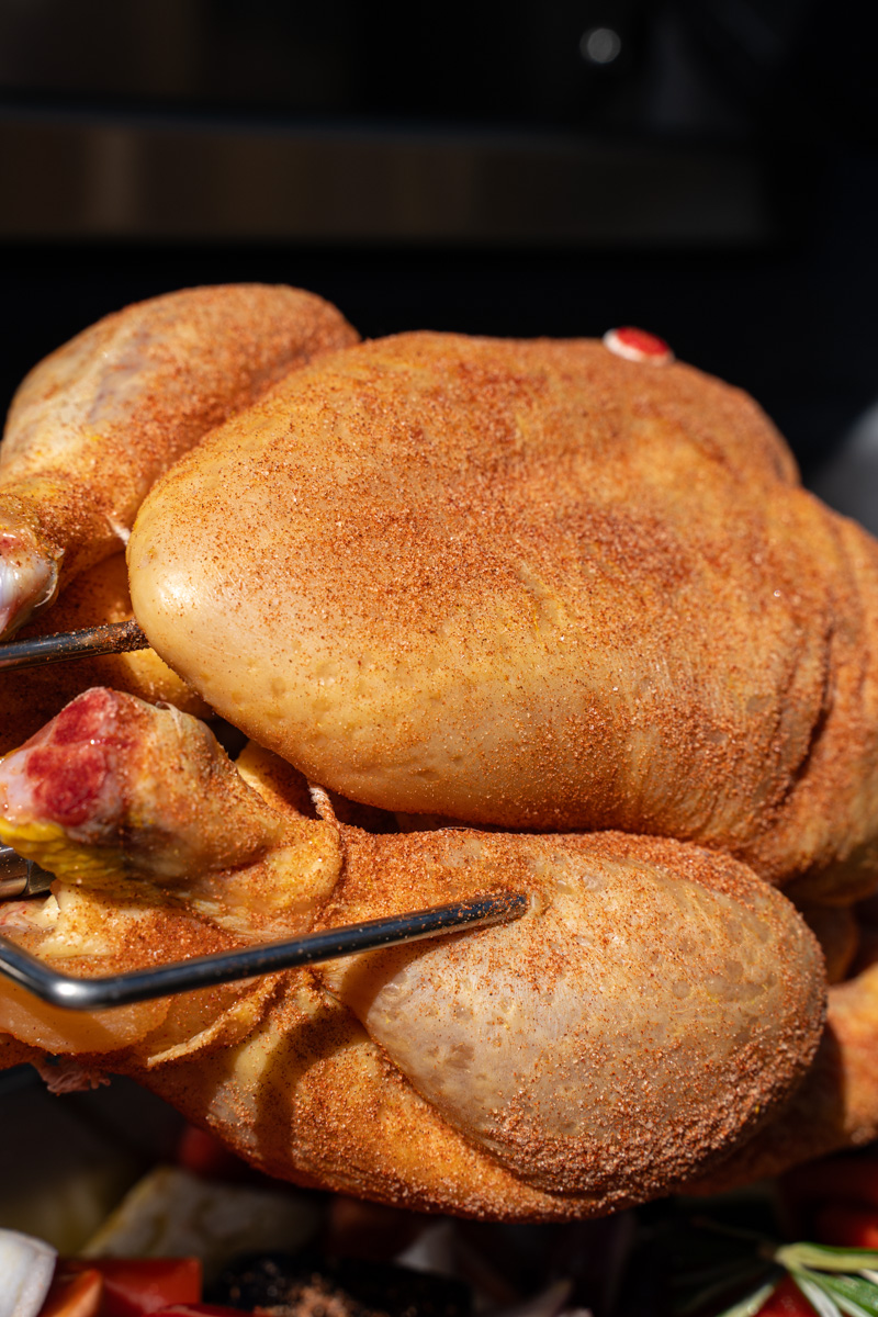 Das Hähnchen rundherum mit eurem Lieblings-Hähnchengewürz bestreuen. Sollte das Gewürz nicht optimal haften, kann das Hähnchen zuvor leicht mit Olivenöl eingerieben werden, um eine bessere Bindung zu erzielen.