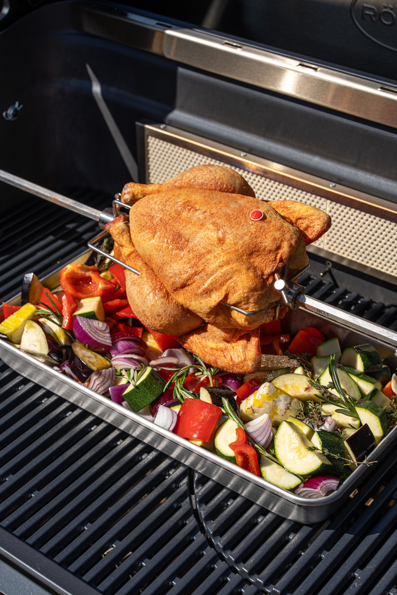 Den Drehspieß in den Grill einsetzen. Die vorbereitete Gemüseschale wird direkt darunter platziert, sodass sie sowohl als Garform als auch als Auffangschale für den Fleischsaft dient. Anschließend wird alles im indirekten Bereich des Rösle BLAZEFLAME Master 4 positioniert. Dafür werden die äußeren beiden Gasbrenner aktiviert, während der mittlere Bereich ausgeschaltet bleibt. Die optimale Gartemperatur liegt bei etwa 180 °C.