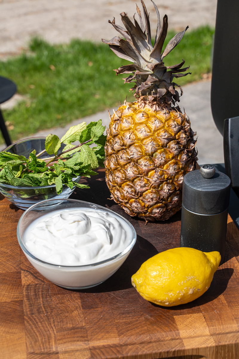 Nun werden alle Zutaten für den Dip bereitgestellt. Die gegarte Ananas wird vorsichtig aus dem Grill genommen und kurz beiseitegelegt.