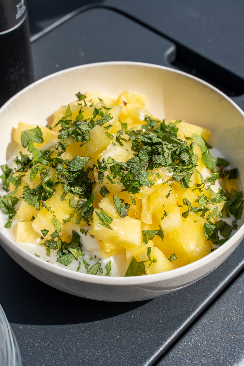 Die Ananas wird anschließend geschält, in kleine Stücke geschnitten und zusammen mit Joghurt, Honig, Zitronensaft und der frisch gehackten Minze zu einem cremigen Dip verrührt.